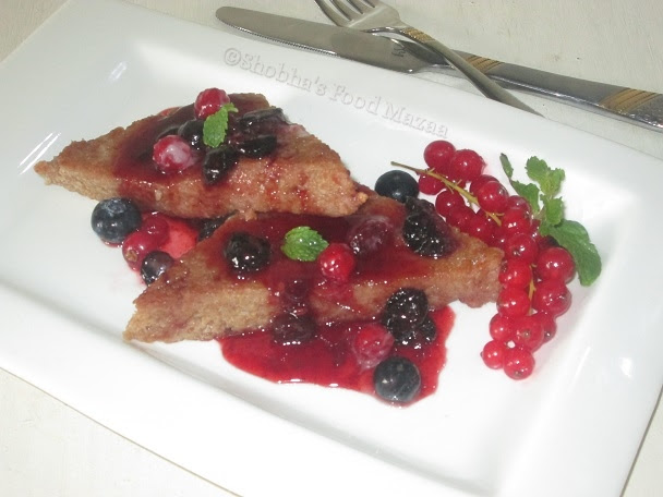 7. To serve place a triangle in a plate and spoon the fruit compote and cider syrup on it. You may use sweetened cream instead of cider syrup.