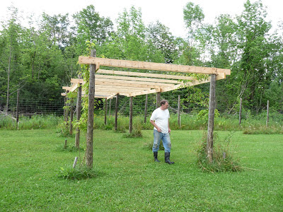 Speaking of eventual crops, Mr. Ferdzy has taken a break from working on finishing the gravel to work on finishing the trellis for our kiwi vines. It's finished! Now all we need is for the kiwis to grow, flower and form fruit. Might happen in the next few years. They have taken a long time to get going though; our soil is too poor and too wet to make them happy. Still, they have grown a lot in the last year or so, and Mr. Ferdzy raised and fertilized some of them and they are doing much better as a result.