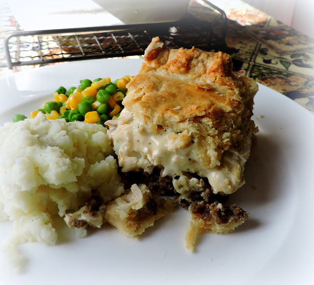 This pie has a triple layered crust. Bottom, middle and top. The crust is like a cross between a tea biscuit and a pastry . . . and it is lightly flavoured with onion . . .